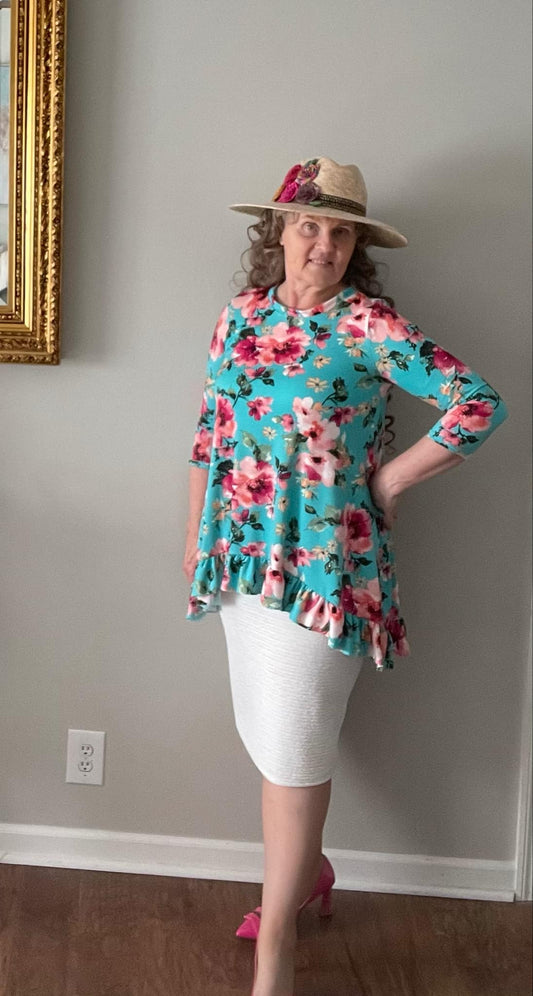 Turquoise/Pink Floral Top! S-1X Final Sale! Cannot be Returned!