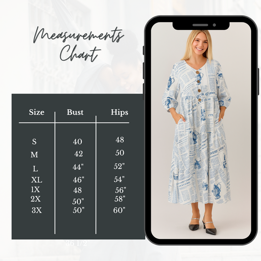 “Nancy" Denim Blue/Teal Newsprint Dress! S-M & 1X & 3X FINAL SALE! Cannot Be Returned!
