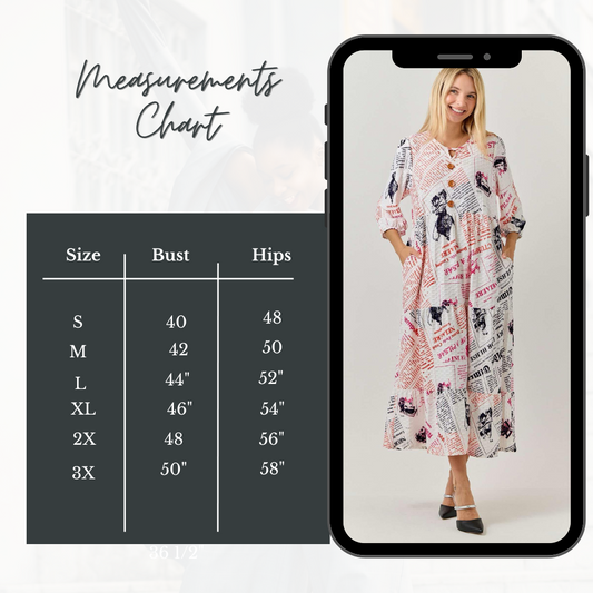 "Beverly" Black Newsprint Dress : S & 2X-3X FINAL SALE! Cannot Be Returned!
