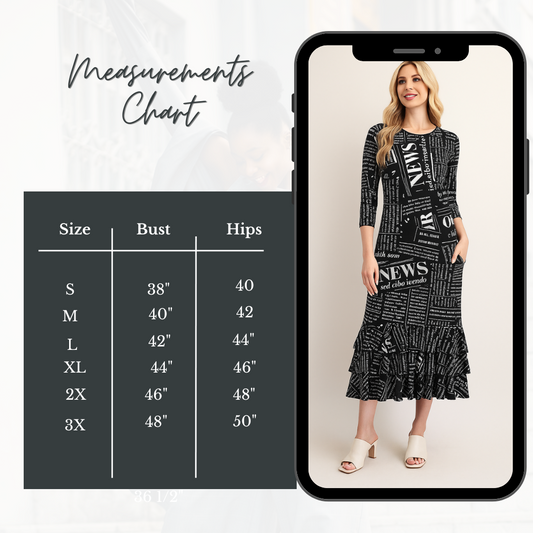 "Beverly" Black Newsprint Dress : S & 2X-3X FINAL SALE! Cannot Be Returned!