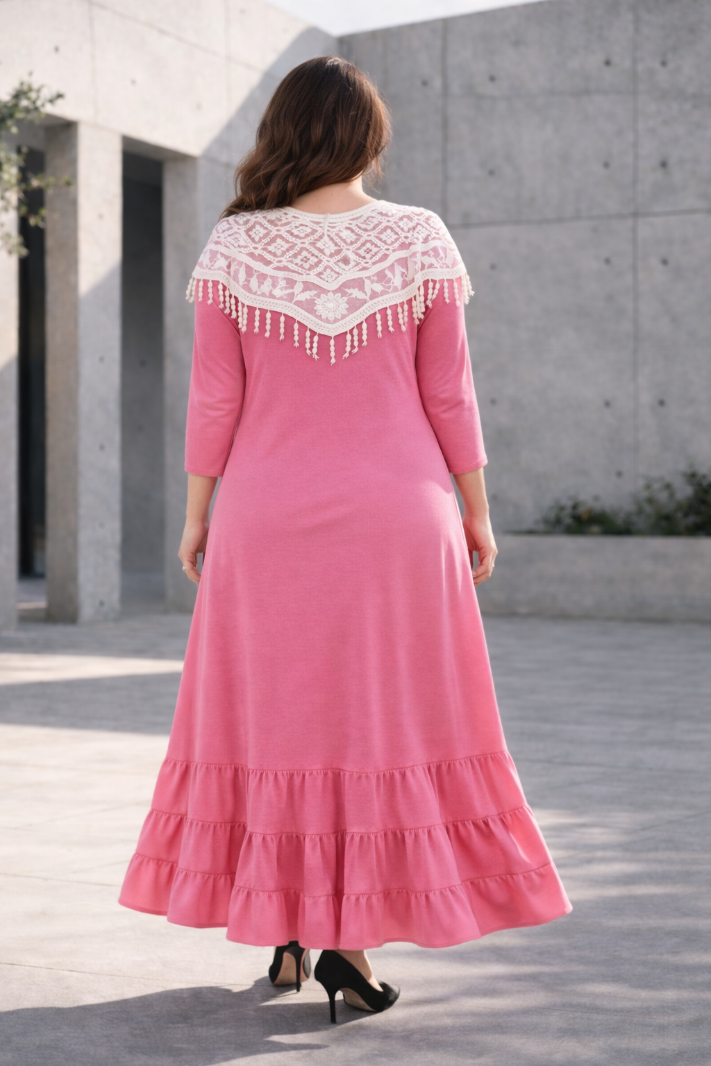 This beautiful lace collar adds such a feminine, delicate touch to our pink maxi dress. The intricate design and soft tassel trim make it feel truly special. 💕