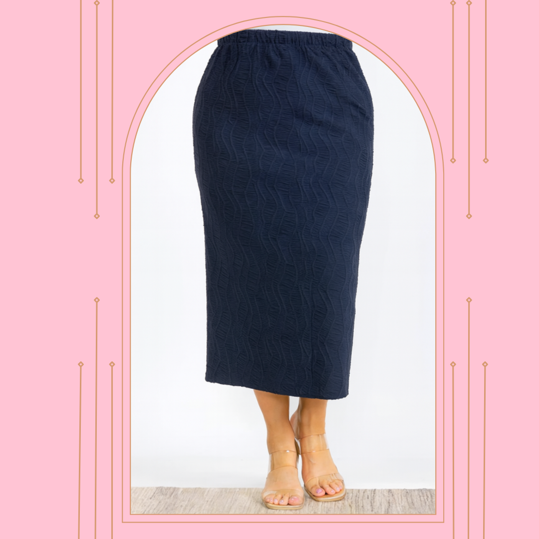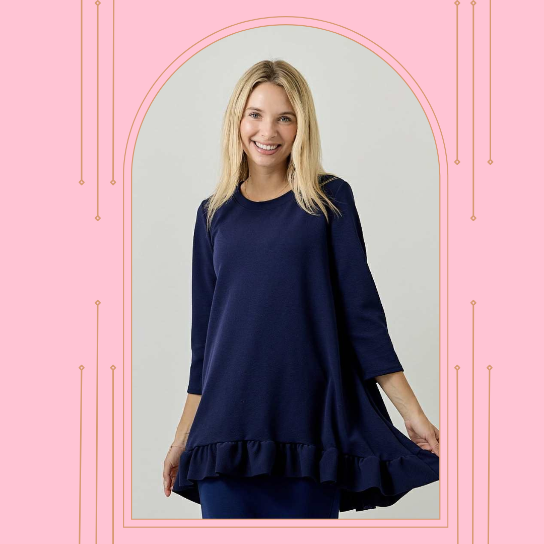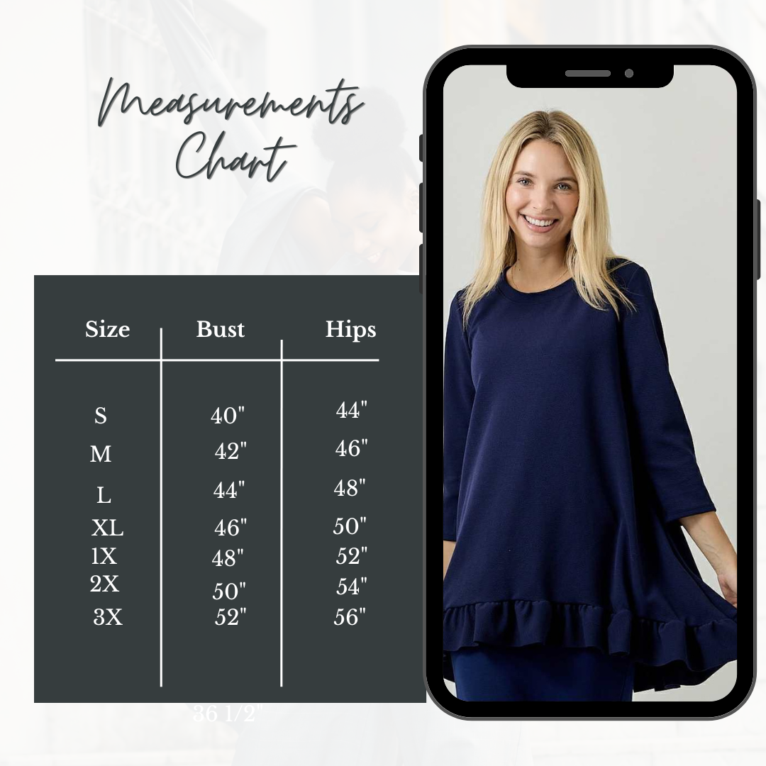 Gorgeous Ruffle Hem , 3/4 Sleeves. Made from "wrinkle-free" textured knit. Pair it with our new Blue Leopard skirt found in our skirts collection. Pair it with our New Leopard Skirt or Solid Navy Skirt, found in our Skirt Collection.!