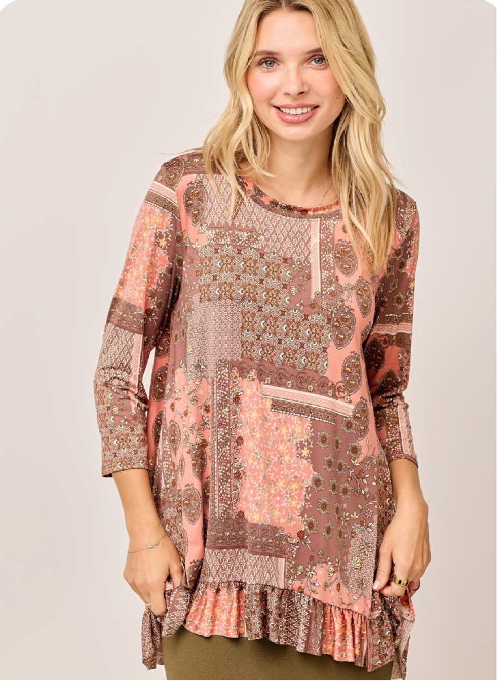 Polyester/spandex Loose fitting style. ruffle hem, round neck, 3/4 sleeve.