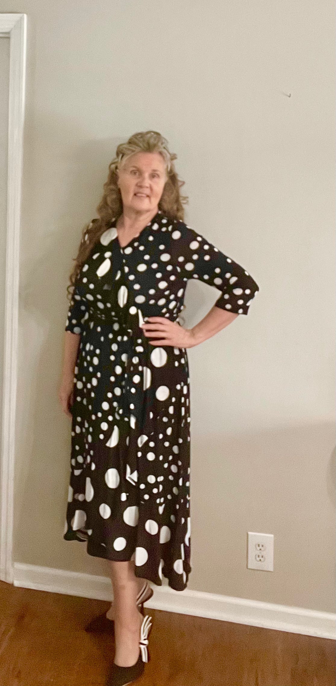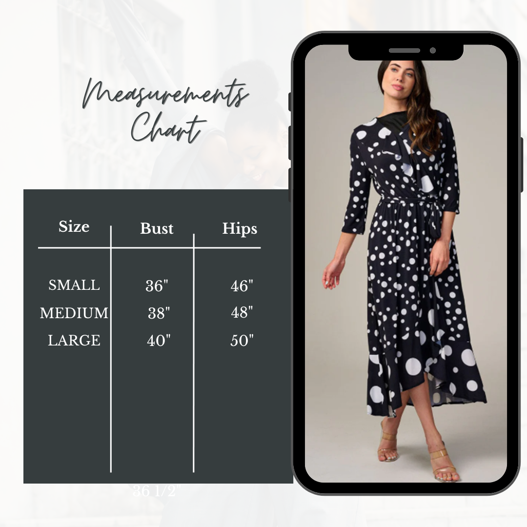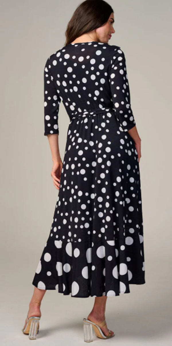 Flattering 3/4 sleeves, convenient front pockets, stretchy elastic waist, and a fun polka dot pattern. Black "modesty panel" in front neckline.