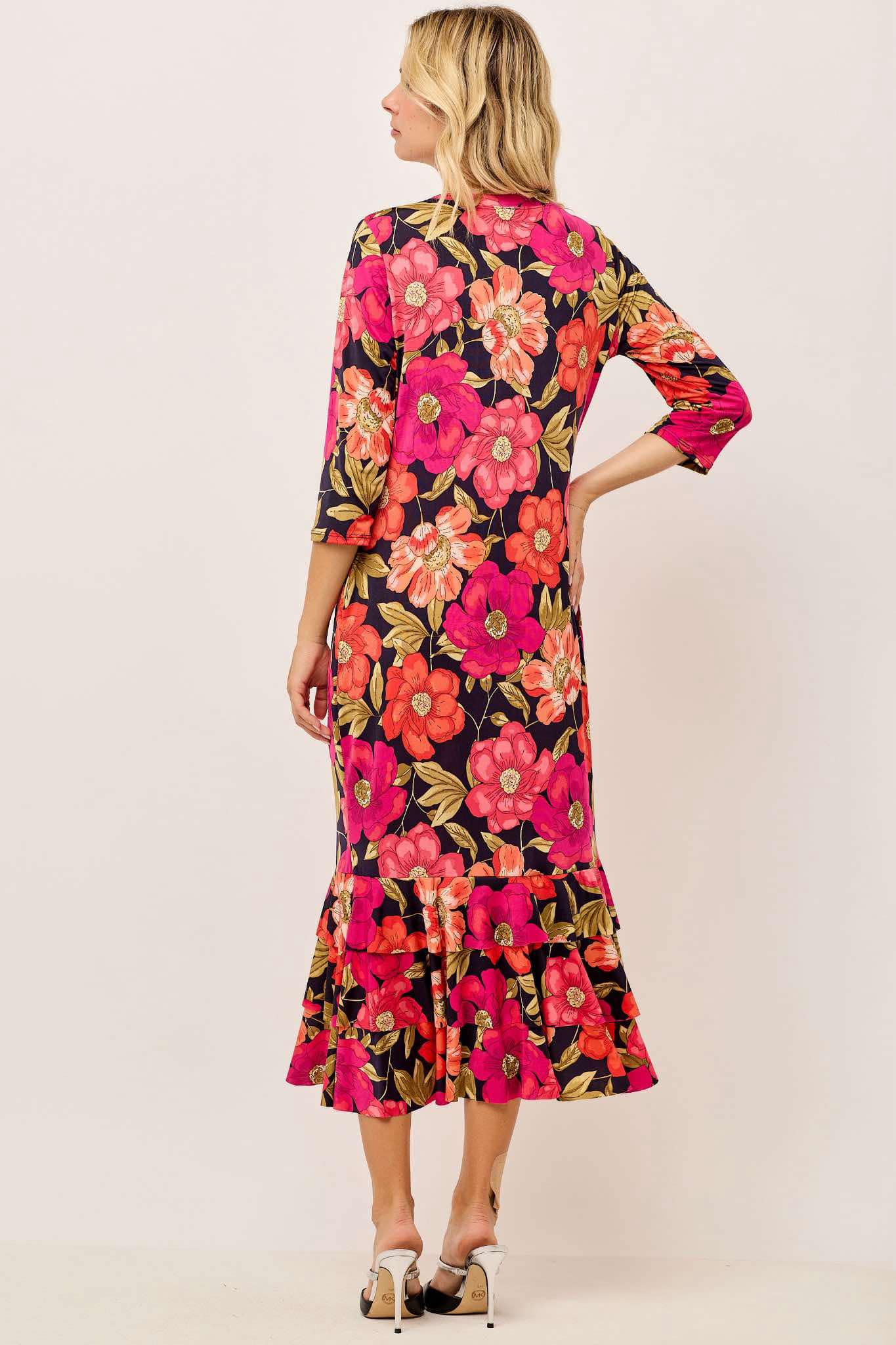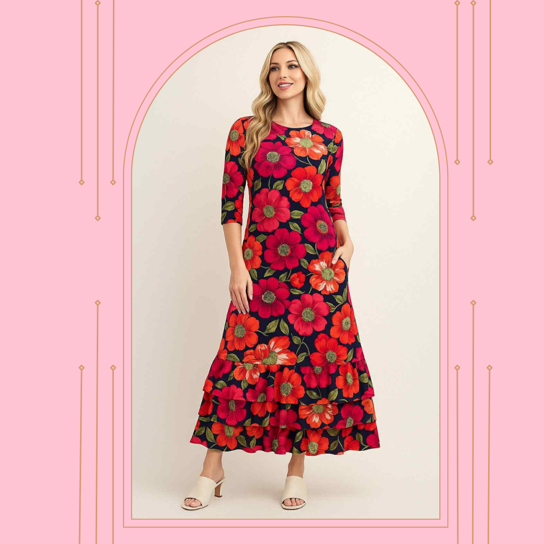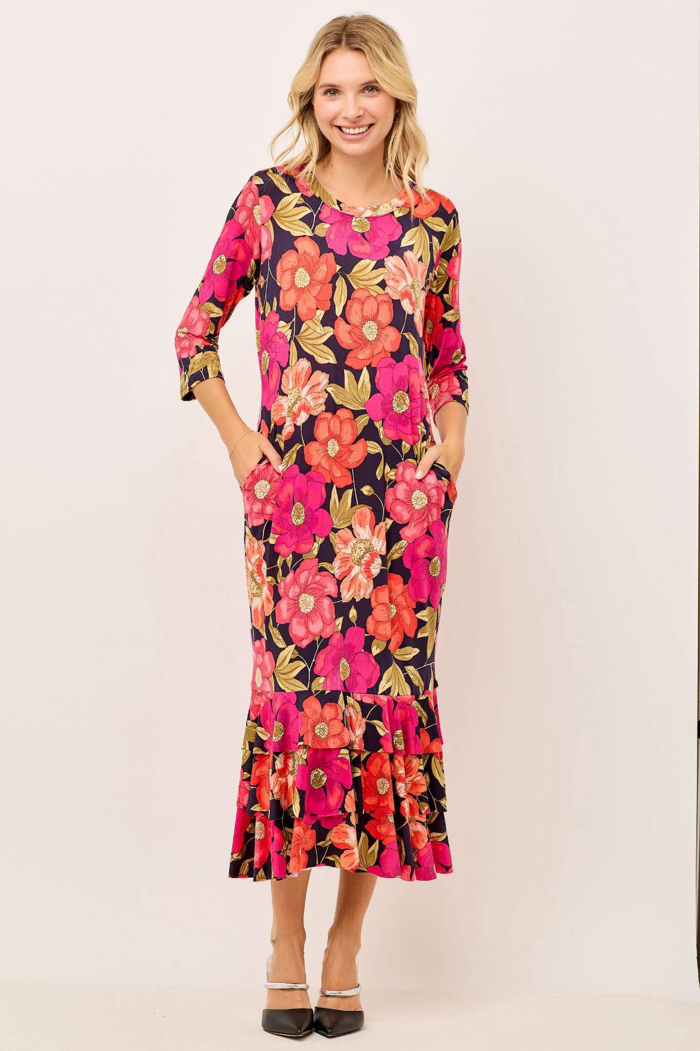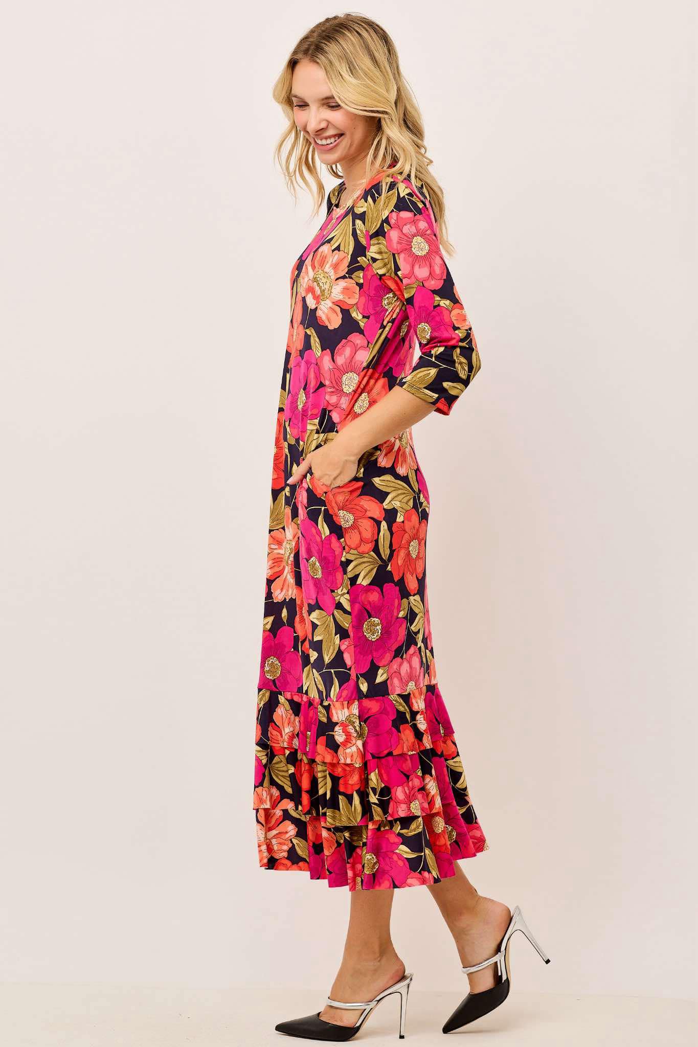 Features: Side Pocket Detail and 3 Tier Ruffle Hem, 3/4 Sleeves.