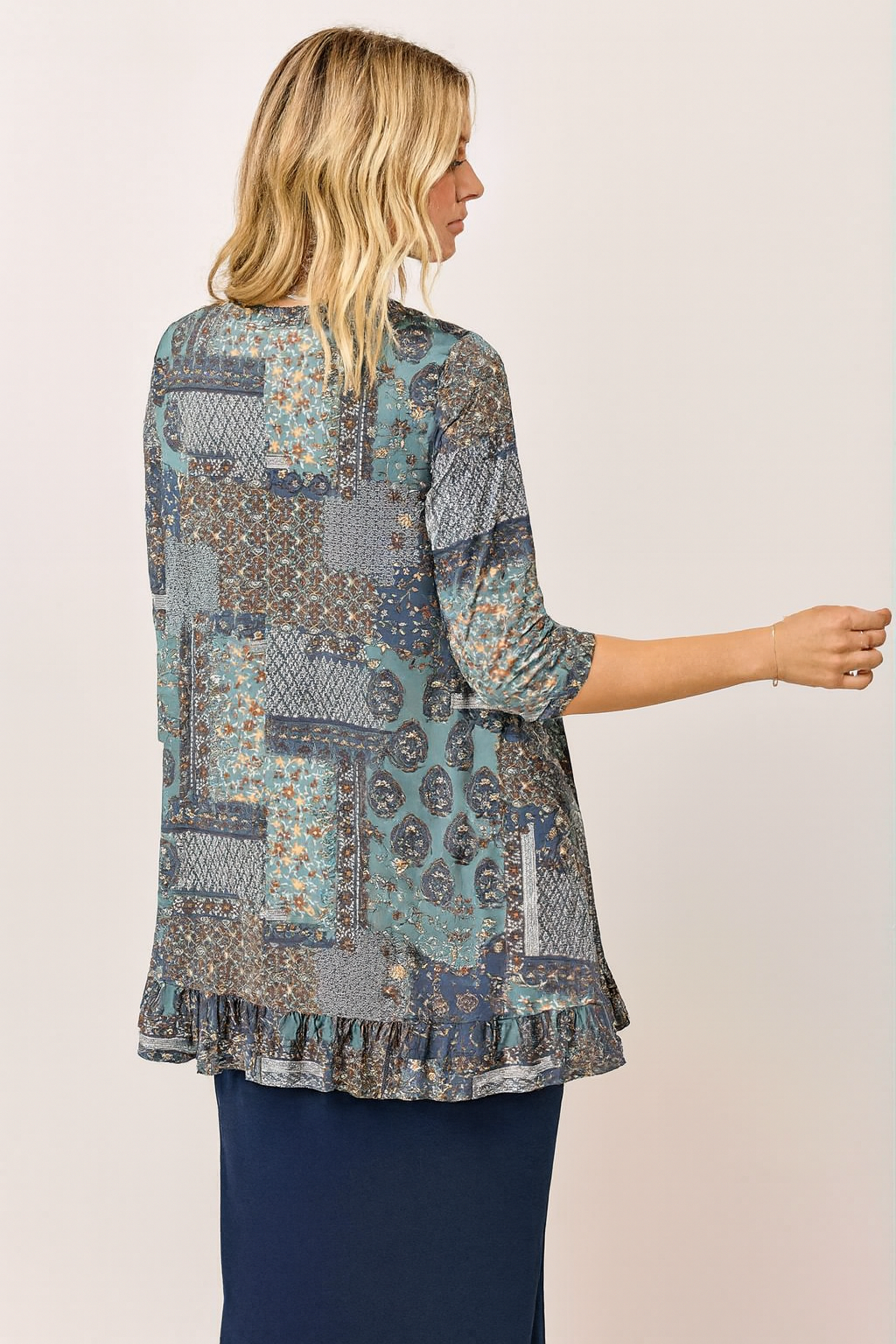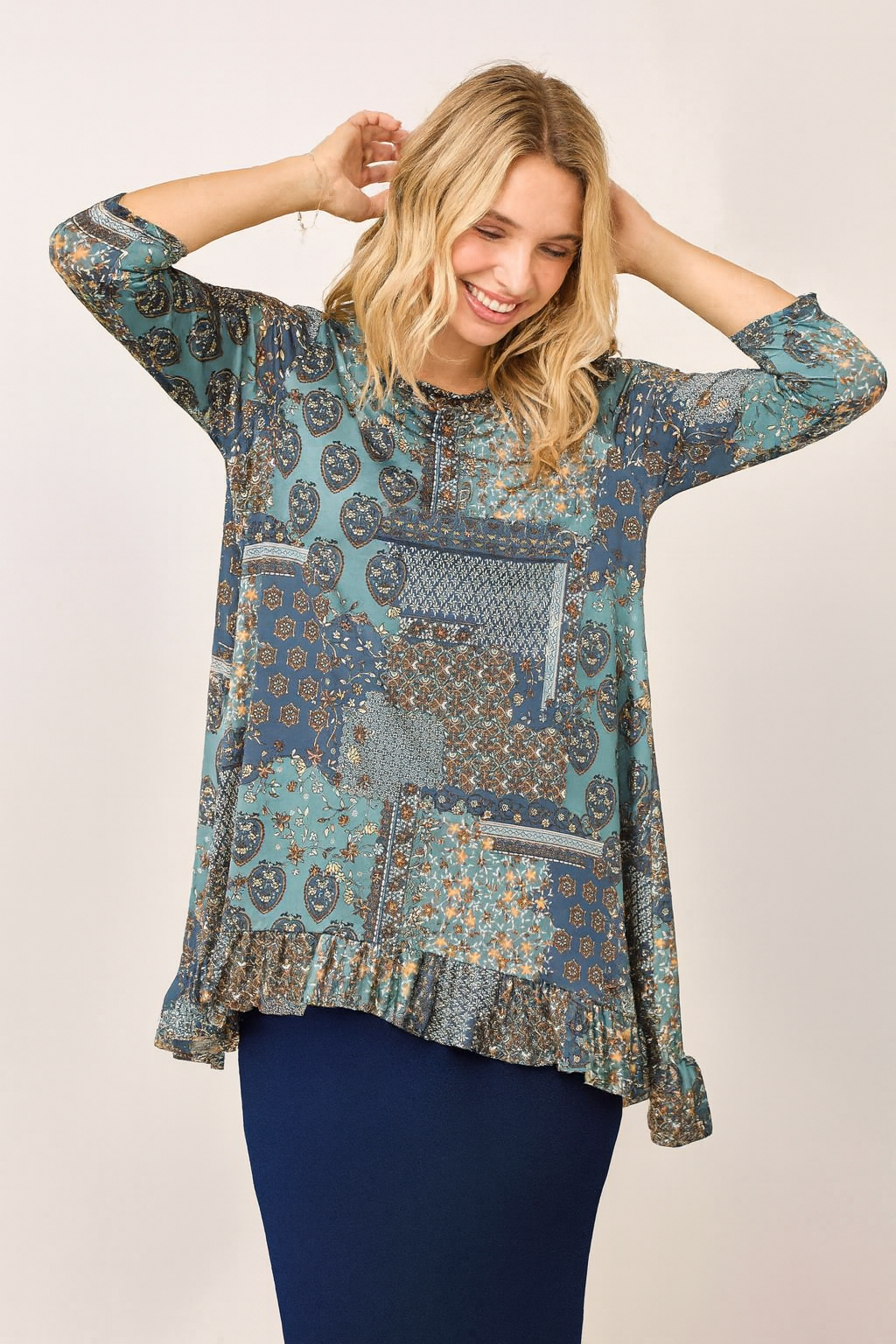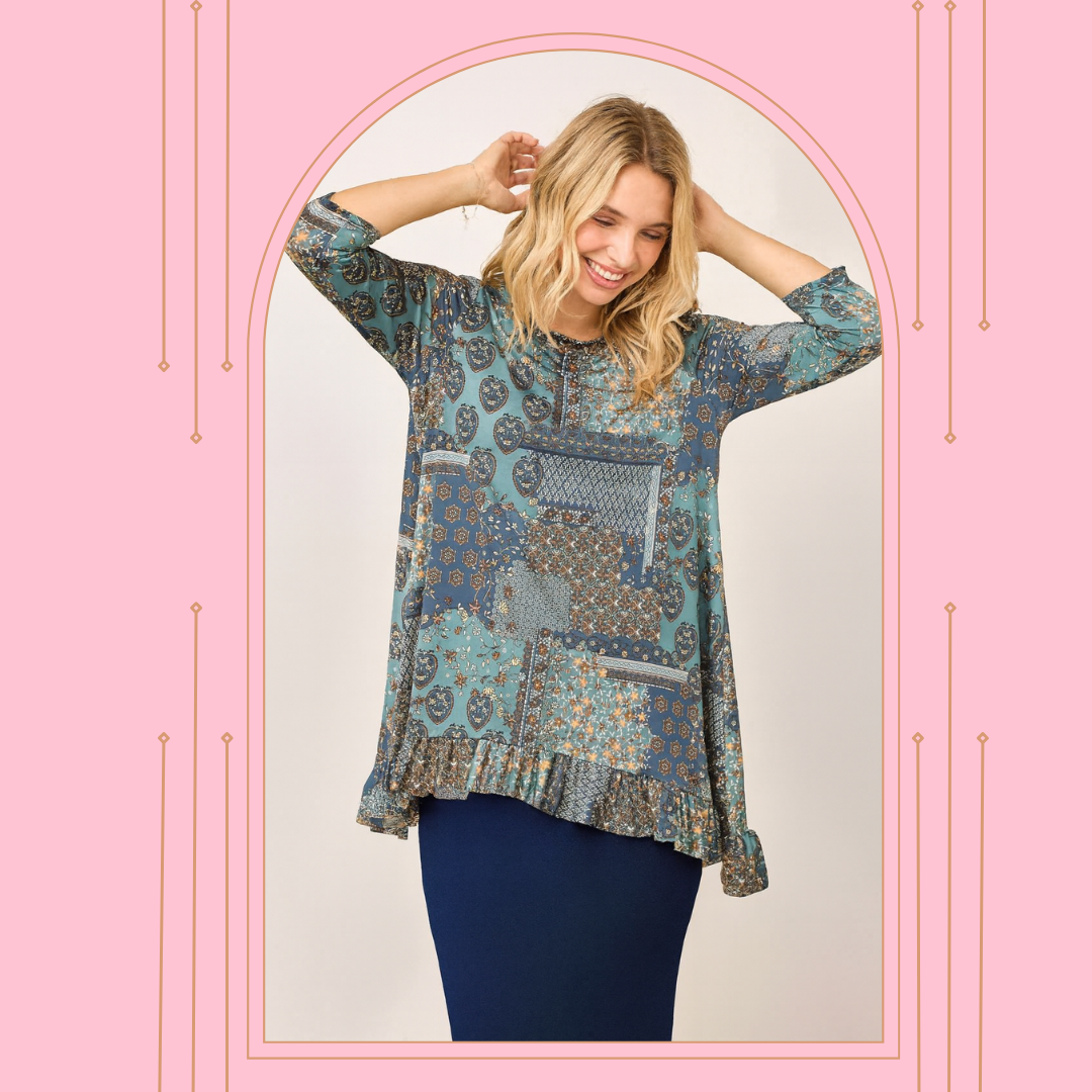 NEW! Blue Print Ruffle Tunic Top: S-3X
