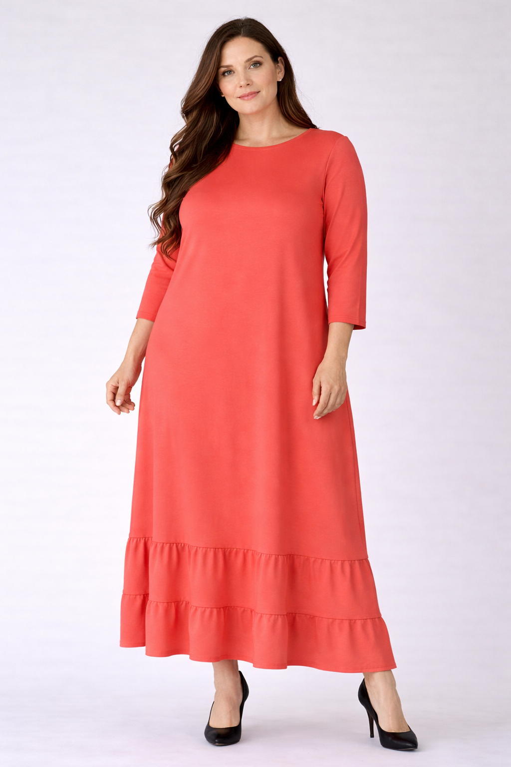 Slight "Aline" Style, 3/4 sleeves and ruffle hemline.
