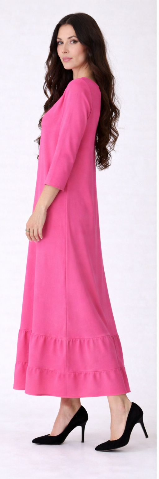 Slight "Aline" Style, 3/4 sleeves and ruffle hemline.