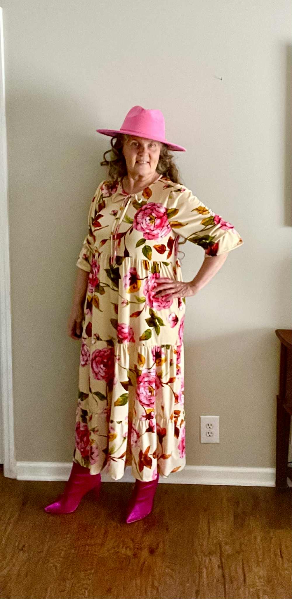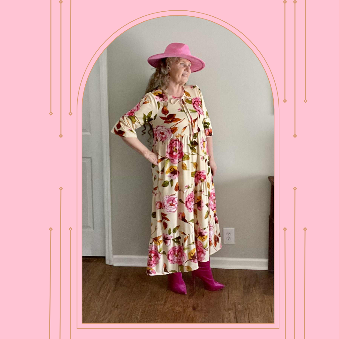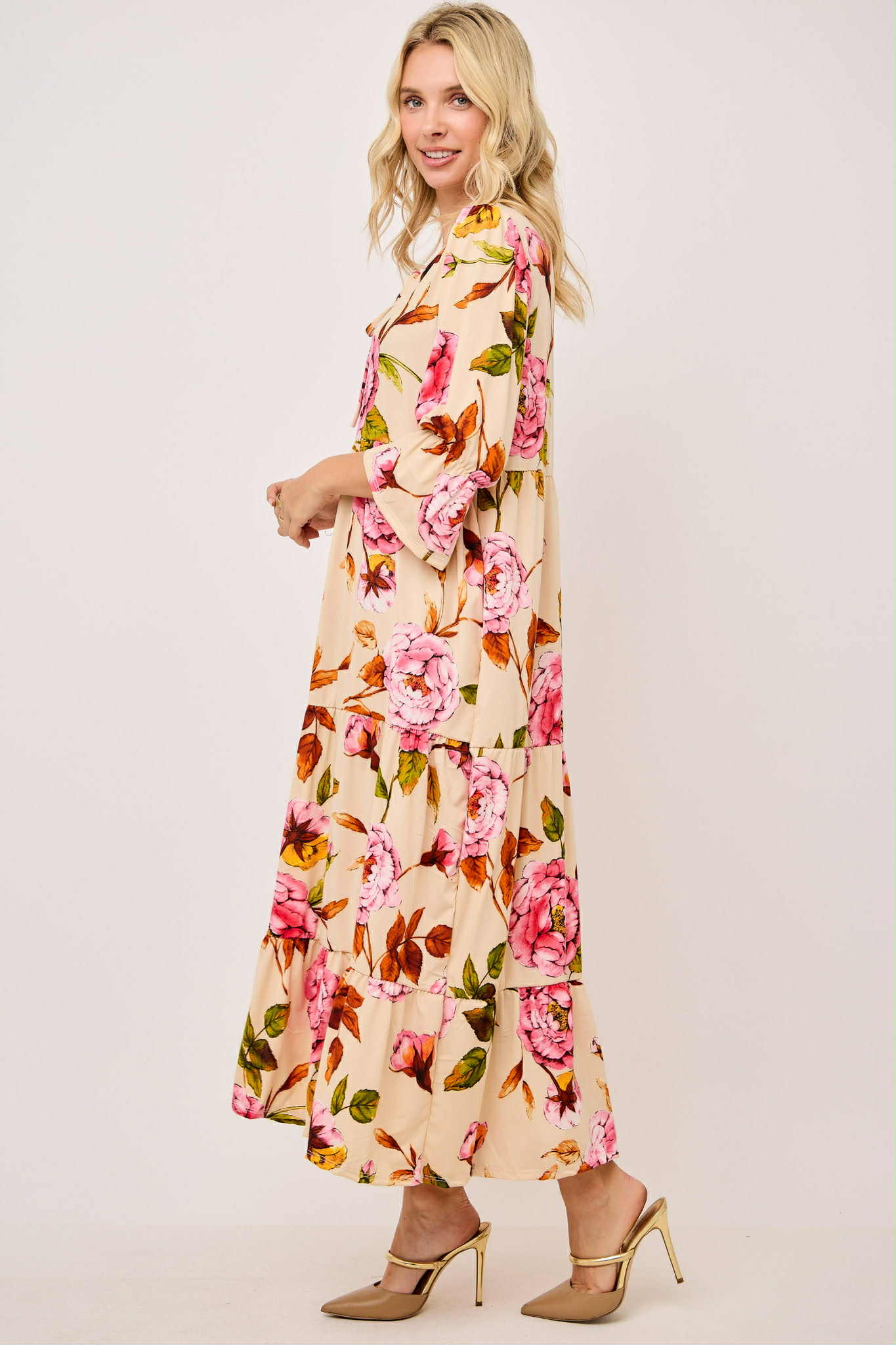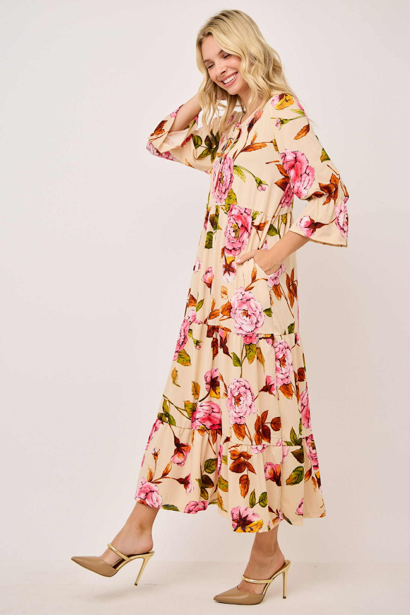 "Victoria Too" Beige Floral Print Dress: S-M & 3X FINAL SALE! Cannot Be Returned!